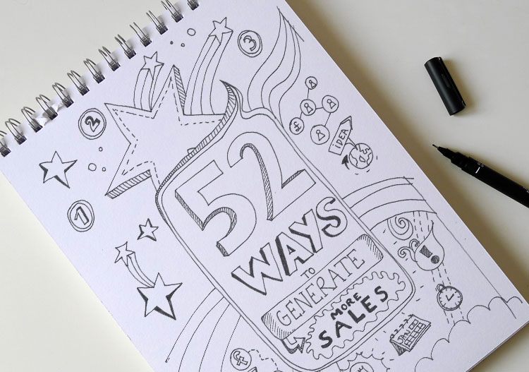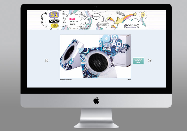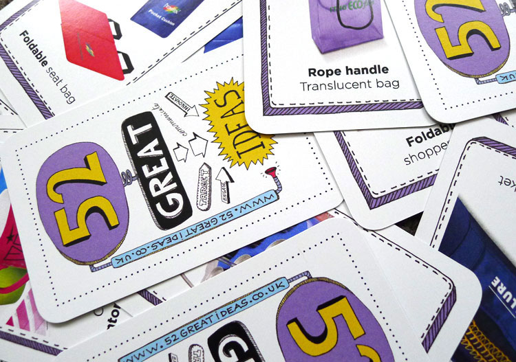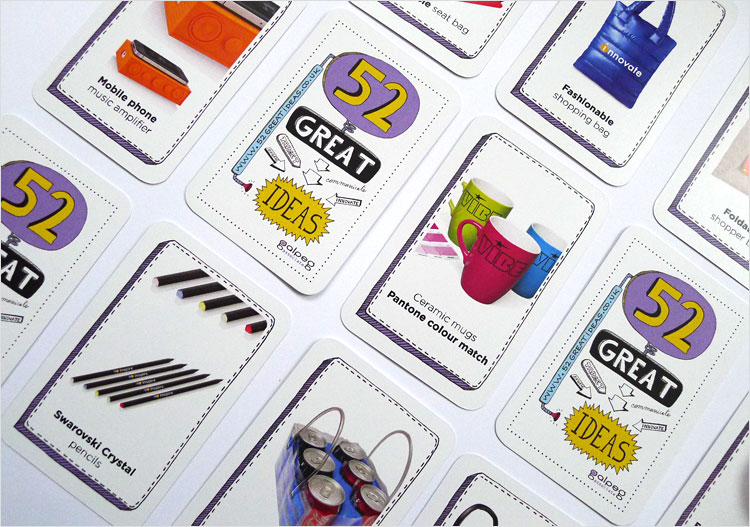 Based on "52 great ideas" (52 products the client had chosen) I created this doodle style design, which I drew and applied to the cards, website, stand and advert.